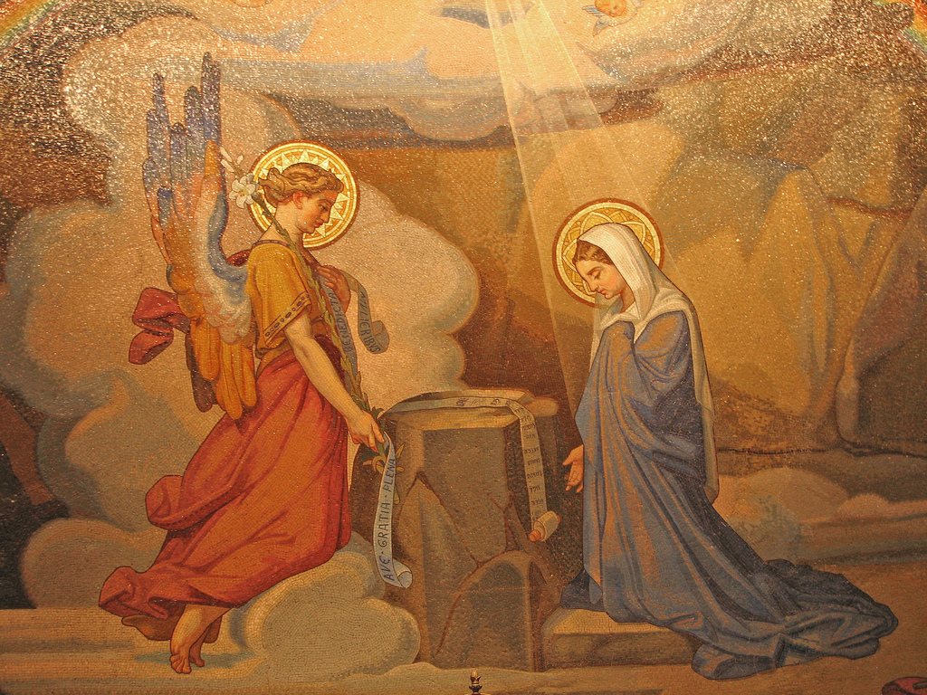 La primera vez que hay un encuentro en las Sagradas Escrituras de santa María con Dios es con el anuncio del ángel Gabriel (cf. Lc. 1, 26-38), cuando dice el texto que María estaba comprometida con José y que el ángel entró en su casa y le dijo “kejaritomene”, es decir, la llena de Gracia. Podemos ver aquí que Dios se muestra como uno respetuoso de sus propias leyes, de su propia creación; Él pudo haber tomado a una virgen no desposada, es decir, siendo Él Todopoderoso pudo haber elegido a cualquiera para que engendrara a Su Hijo, sin embargo eligió a una joven que ya estaba comprometida en matrimonio. Nos dice el mismo Jesucristo a manera de confirmación que el sentido de los cuerpos es uno esponsal (cf. Mt. 19, 3-6), esto es, el ser humano fue creado para entregarse físicamente a su complemento haciendo referencia al texto de Gén. 2, 24, por lo tanto, Dios decide respetar esto en María, resaltando así la fecundidad del Amor que Ella ha recibido de Él. Este Dios, el Padre de nuestro Señor, el Único Dios, es coherente y no contradictorio. Por lo tanto, Dios no es uno que dice primero sí y luego dice no, sino que todos Sus Planes en nuestras vidas van unidos.